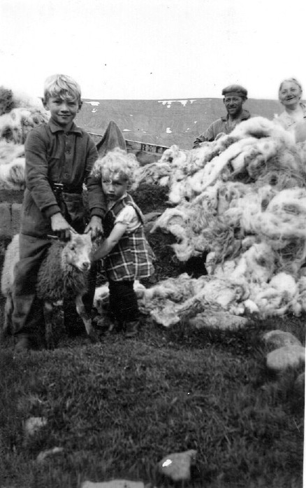 Fjárbóndi með gimbur sína, Kristín systir heldur í og Gústi á Stað og Jóna móðir hans fylgjast með
