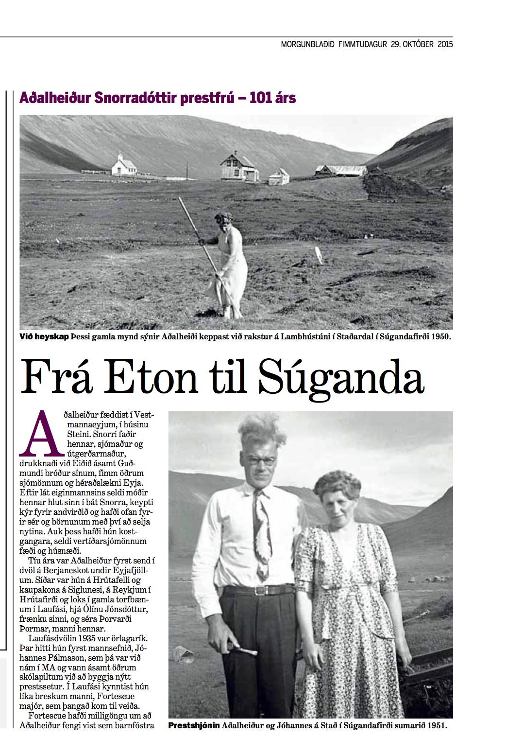 Grein í Morgunblaðinu um Aðalheiði á 101 árs afmæli hennar