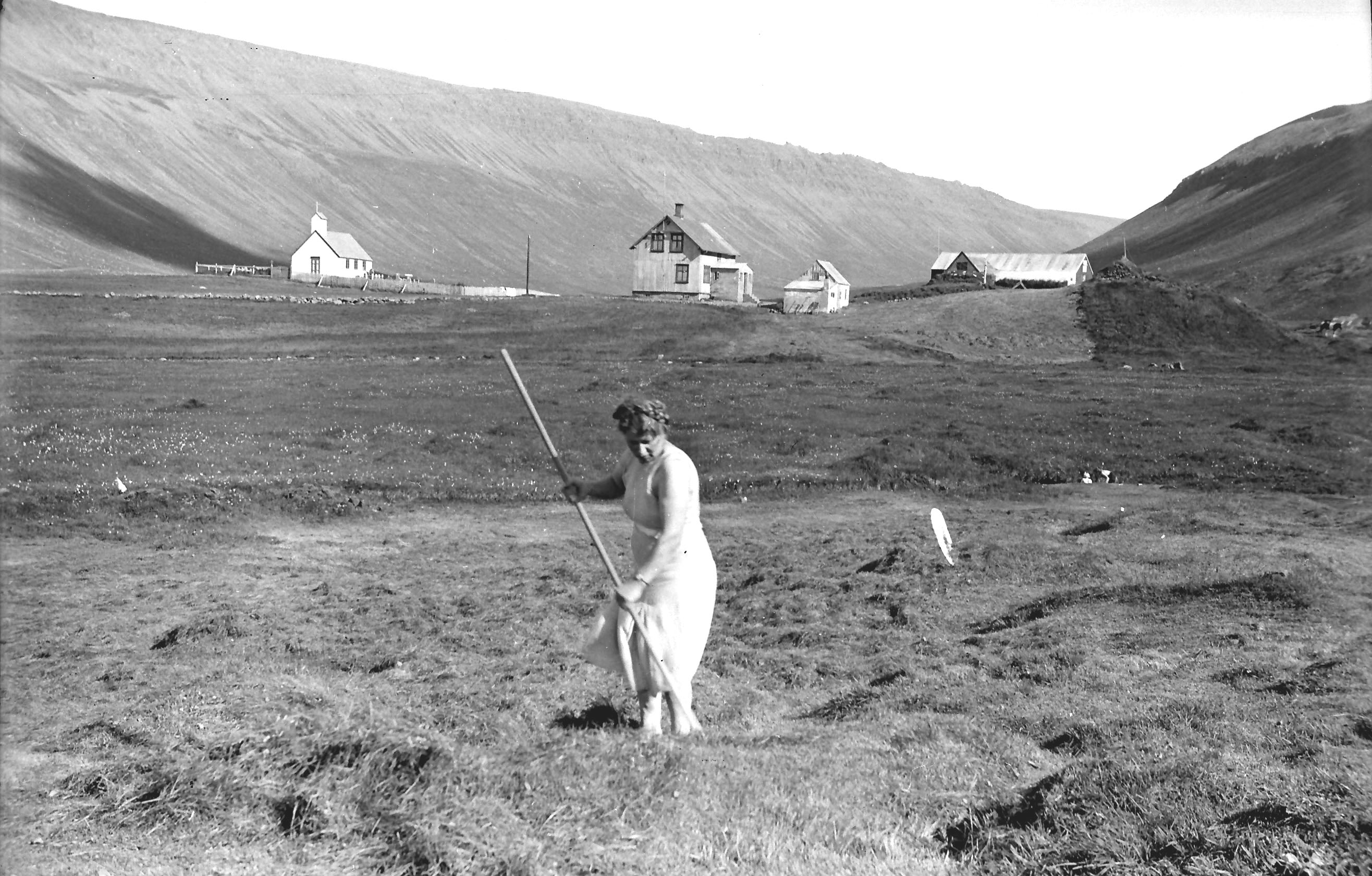 Aðalheiður við rakstur á LambhústúniÞað þurfti að glíma við ýmislegt en öllu er hægt að venjast. Til dæmis þurfti að fara út og upp fyrir hjall til að komast á kamarinn. Þegar snjóaði þá var hann svo óþéttur að maður settist á skaflinn. Jóhannes mokaði nú öðru hverju, svona svo við kæmumst inn. Það var nú bara fullorðna fólkið sem notaði þetta, börnin fengu að pissa í koppinn. Ágúst og fjölskylda hafði fjósið, þegar þau voru með gegningar, en mér fannst þetta afleit aðstaða. Það lagaðist þegar Jóhannes byggði forstofu við húsið og lagði fyrir klósetti. Þar komu líka skápar. Eitthvað var um skápa uppi en ég hafði hvorki tauskáp né fataskáp. Þegar forstofan var byggð fékk ég bæði klósett og skápa. Þetta fannst mér alveg draumur, maður kann fyrst að meta hlutina þegar maður hefur verið án þeirra.