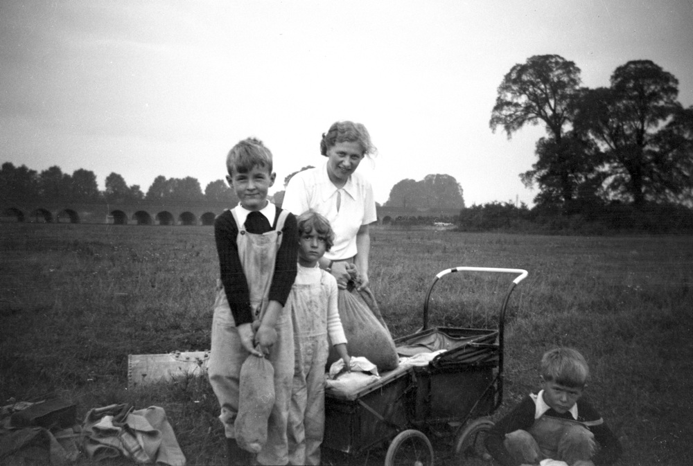 Aðalheiður í garðyrkjustörfum á Thamesbakka með börnunum sem hún gætti.